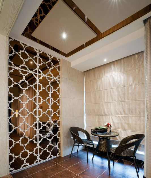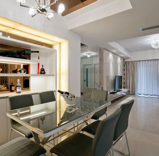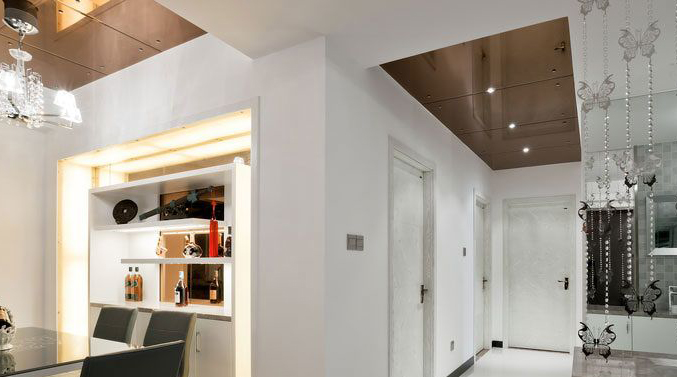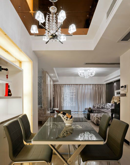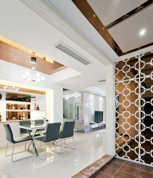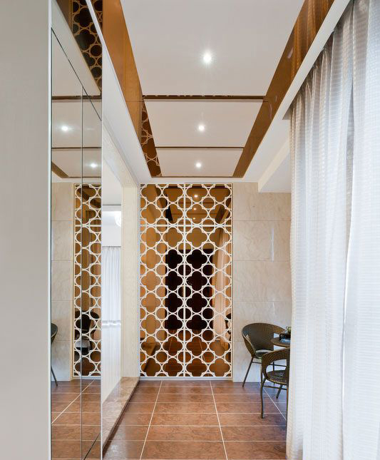 接手本案例時業主工程已經進行到木作。整個空間設計上只能不改動原有的大體格局的情況下,在后期的木作和軟裝去調整,設計手法的運用上試著用純粹干凈的線條搭配出溫馨柔和的自然色調。原有的入戶空間與餐廳空間、客廳背景與洗手干區在造型、色彩與材質上相互的銜接,讓空間巧妙融合。入戶玄關的暗門上運用了密度板的樓花造型,深色茶鏡在樓花的造型映襯上顯的格外的靈動。并于吊頂相互的銜接,使得天花的視覺上有了無限延伸效果,餐廳處備餐柜兼具實用與隔斷功能,周邊的柱子運用透光云石的修飾,備餐柜成為了餐廳空間的主軸??蛷d空間電視柜的石頭臺面貫通至洗手臺處,高低錯落感讓臺面凸顯出層次。削弱了單一感。幾只蝴蝶的掛簾給空間帶來了生活的情趣感。