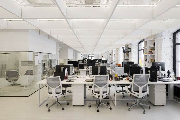 公司若干員工共同使用一個大辦公室,這樣的辦公空間靈活性和利用度相對較高,開敞式員工辦公室表面上呈不規(guī)則布局,實際上應按照各種職位的工作流程及景觀要求布局,強調(diào)員工之間的平等、自由的工作關系,強調(diào)信息交流的功能,有助于簡化管理。